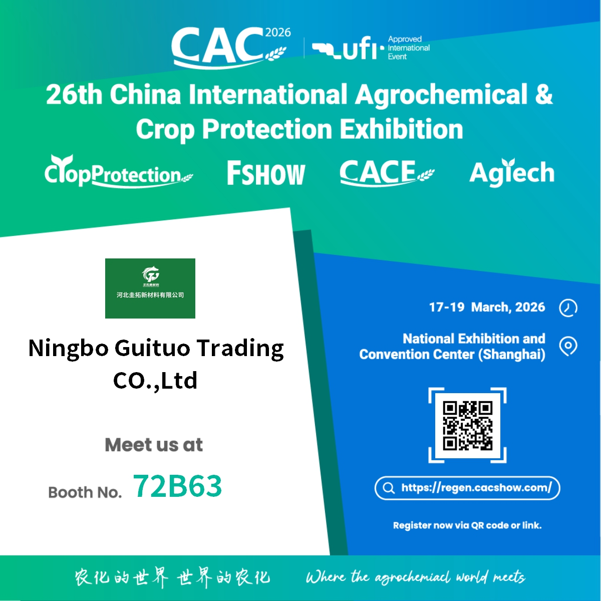 Công ty TNHH Thương mại Ninh Ba Guituo tự hào thông báo sự tham gia của mình vào Triển lãm quốc tế về hóa chất nông nghiệp và bảo vệ cây trồng Trung Quốc lần thứ 26 (CAC 2026) . Sự kiện uy tín toàn cầu này sẽ diễn ra từ Ngày 17 đến ngày 19 tháng 3 năm 2026 , tại Trung tâm Hội nghị và Triển lãm Quốc gia ở Thượng Hải.